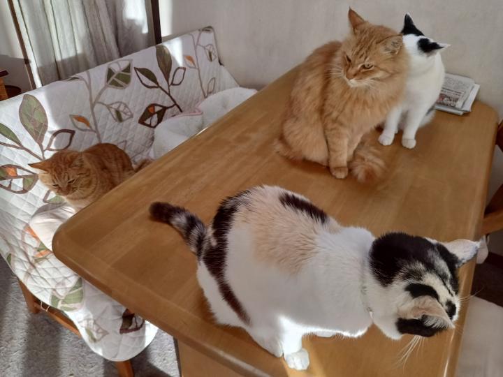 画像が無いと寂しいので、我が家の猫達の全員そろった珍しい写真をどうぞ。