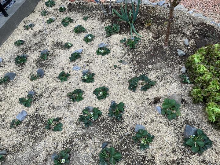 カリフラワーは蒸れてダメになりましたが、水菜やほうれん草、レタスは食べ頃、いちご🍓の苗は花が咲いています。