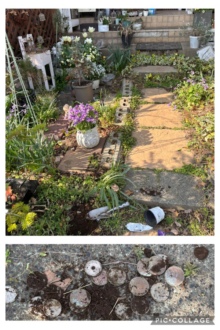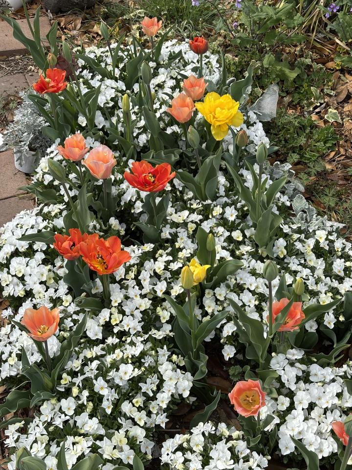 チューリップ🌷花壇、白いビオラが満開!