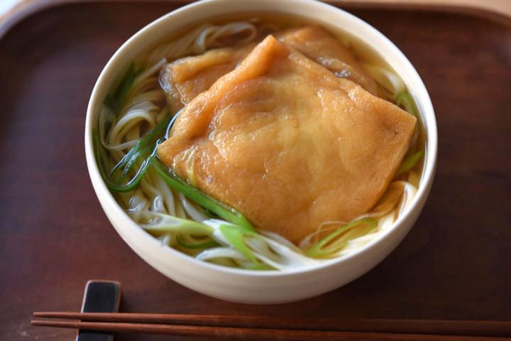 うどんはできるだけ食べる直前に茹でて玉取りして人数分で分ます。熱くゆがいて丼に入れてだしをはり、油揚げを載せます。蒲鉾を切って添え、好みの量の青ネギを入れて完成です。季節により柚子が手には入れは皮の小片を添えても良いと思います。