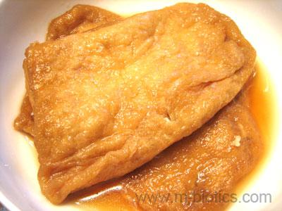 鍋に鰹だし(お湯+粉末鰹だしでも可)をはり、沸騰したら油揚げを入れます。味付けの順番は砂糖を入れて暫くして煮詰まったら淡口醤油を入れます。落し蓋をして煮汁が半分程度なるまで中火で煮ます。仕上に味醂を入れても良いですが油揚げが少し硬くなります。