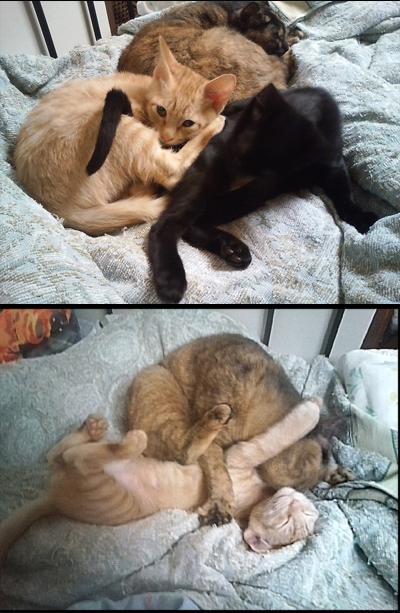 兄妹でとても仲良しで、先住猫2匹ともそこそこ仲良くしています。