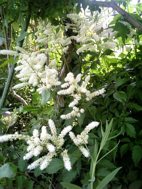 ショウマです。普通のより穂がフワフワとしてます。だから、ホザキショマというのだと思いましたが・・・定かでないです。他に赤とピンクも咲きますが今は白が一番綺麗に咲いてるので載せます。