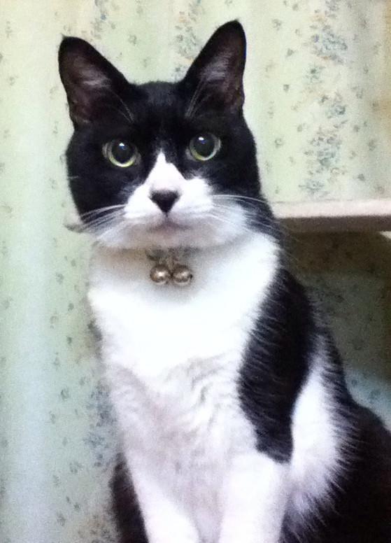 ま町の白黒:とても良く似てるが顔のハチワレ模様が違う、首輪無し