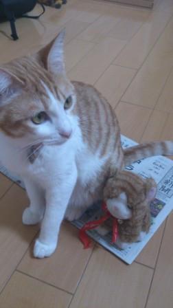 私のベッドの上に、雨さんに似た小さい猫ちゃんのぬいぐるみが