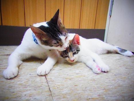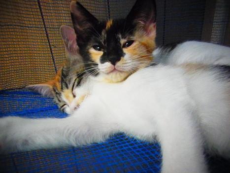 黒ちゃんが白三毛ちゃんを枕にしてました~ ( ̄m ̄〃)