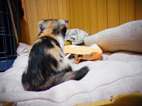紙袋で仲良くあそぶ、白三毛ちゃんと黒ちゃん♪