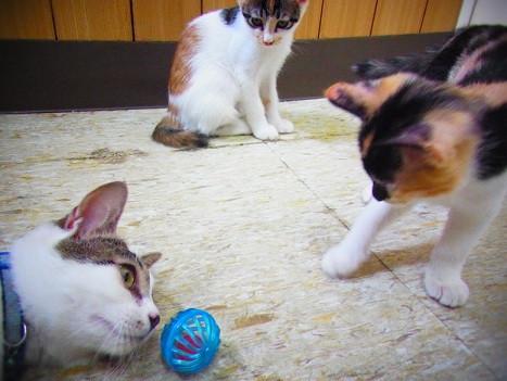 すずボールで仲良くあそぶ、白三毛ちゃんと黒ちゃん♪