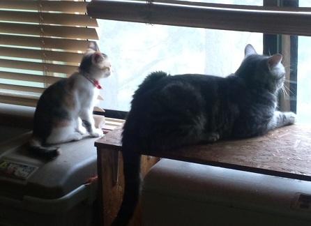 先住猫ちゃんの「ハルちゃん」と、仲良くお外を見てますね。
