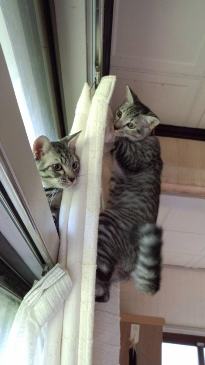 ようやく網戸にのぼらなくなったと思ったら 今度はカーテンです。