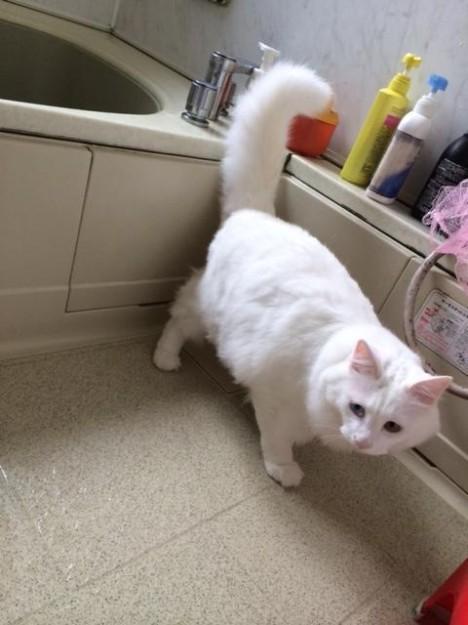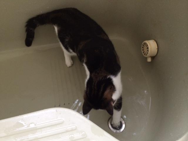 お風呂で水遊びするマロ。排水口が気になるみたい。