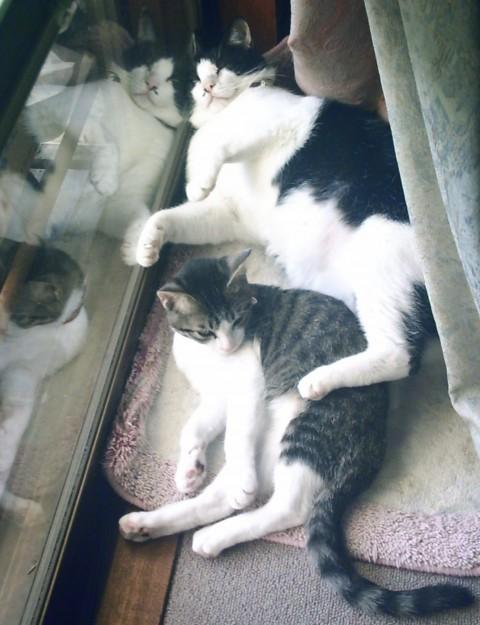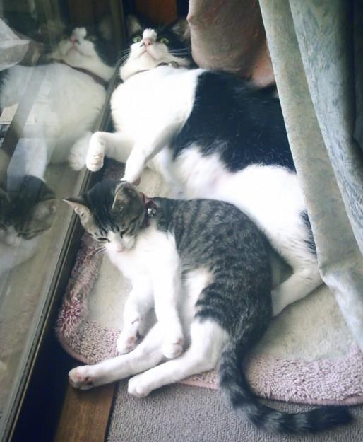 サッシ戸の、カーテンのところに、ふたりでマッタリしています。