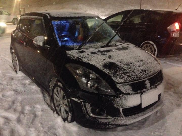 高速道路で20kmで淡々と雪が降ってないところまで走りました笑