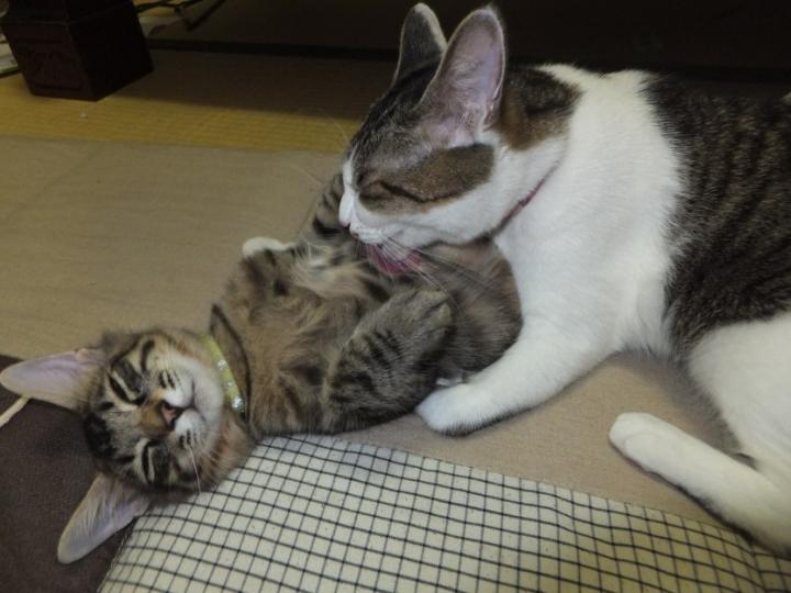 来たばかりのレオ君をかわいがる福ちゃん