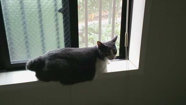 おとっつあんの椅子の背もたれに登っててっぺんでバランスとって