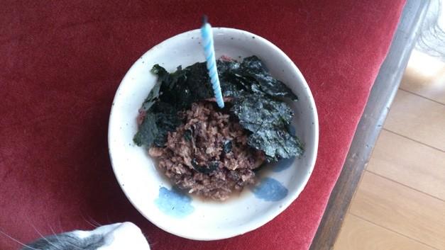 2歳のお誕生日朝のご飯は初めて飲む猫ミルクとタマの伝説まぐろとモンプチビーフテリーヌ、好物の海苔をトッピングしたスペシャルメニューですw