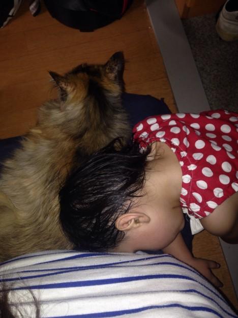 遊び疲れて、猫さまに頭突きしながら眠るちび。