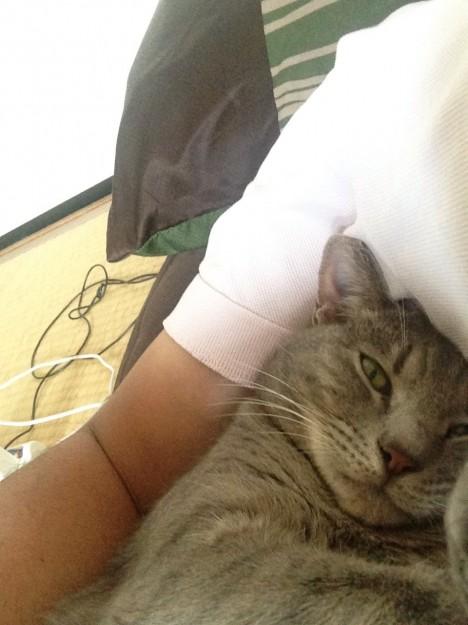 下僕の脇の下がお気に入りらしく、この猛暑のなかピッタリフィット…