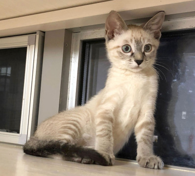シャム系MIXです。目は青。シッポまっすぐで長い。
