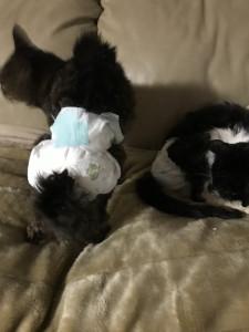 もうすぐ19歳(メス)と18歳(オス)になる老猫がいます。至る所でするようになったので、現在二匹ともオムツをしています。病院の先生に、うんちのことまで考えると人間の赤ちゃん用のオムツが一番いいと言われたので、現在新生児用のオムツを前側後ろ側を逆にして、尻尾の部分は十字に切ってしっぽを出しオムツをつけています。