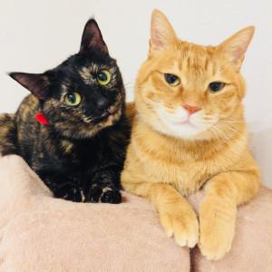 3歳のオス(茶トラ去勢済)、2歳のメス(黒サビ避妊済)がいます。