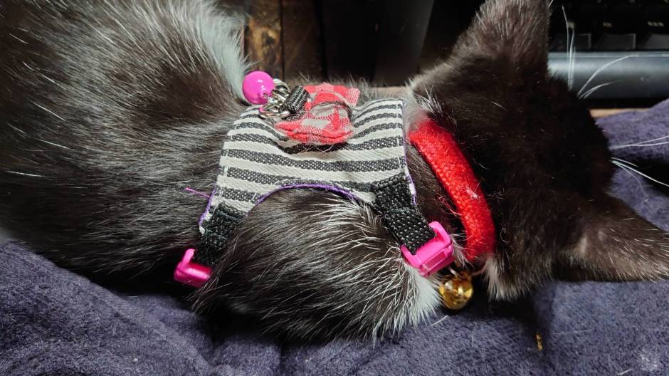 3ヶ月ですと1キロ程度あるかと思うんですが、このサイズですとフェレットとかのMサイズくらいのハーネスが合います。(小さい猫ならSサイズ最大でいけるかと思います)