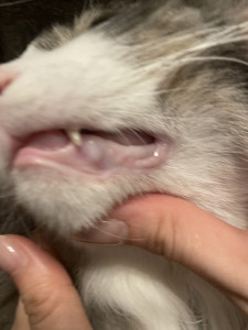 こんにちは。ご心配ですね。 私はお写真のようなものを見たことがなく、 先ほどうちの子(2歳前後)3にゃんのお口の両側を確認しましたが、 どの子にも似たようなものはありませんでした。 病院が苦手な子とのことですので、 まずはこのお写真をかかりつけの獣医さんに見てもらってはいかがでしょうか? 無事をお祈りしております。
