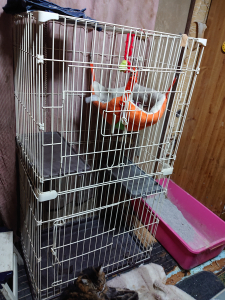 潜り込めない部屋を作るのが難しい状態で、今は主人と私の寝室にケージがあります。ケージは2段です。大体1番上にいますが、遊んで欲しい感じの時は1段目の所へ座って私を見てきます。