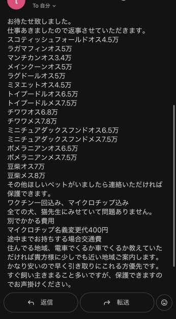 掲載ページでは譲渡費用はかかりませんと記載があったのですが、数日して返ってきたメールではこんな風に該当の猫ちゃん以外にも、犬猫の一覧が送られてきます。