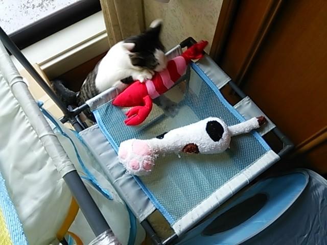 何か噛みたいなら、エビを噛んでね、と新オモチャえびを投入。