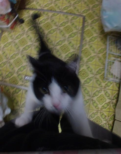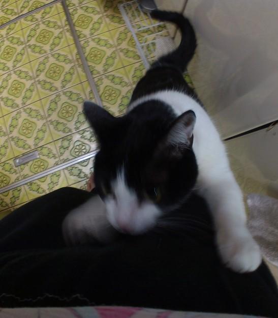 朝、台所に居ると、起きて来て、両手(正:両前足)を広げて、ぴょんぴょん跳び付きます。