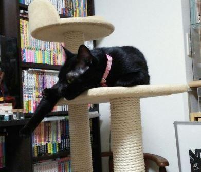 何故かタワーの上で出迎えなければならないと思ってるのか、ドアを開けるとちょうど、寝室から飛び出してタワーに上ったところでした。