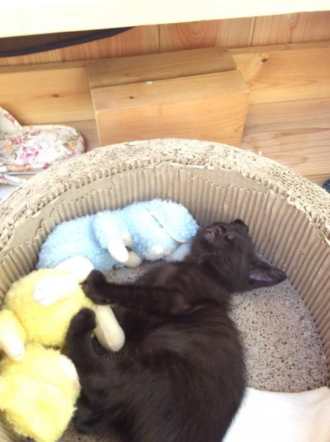 元気いっぱい走り回って疲れたね。おやすみなさい。
