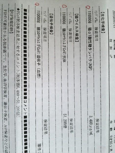 あずきちゃんの場合、猫コロナウィルス(FCoV)抗体が51.200倍と言う異常な数値が出ています。猫下痢パネル検査(FCoV)も陽性なので間違いないです。」