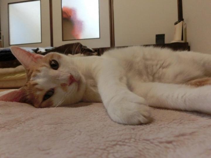 ウチの侵略者、今日はホットカーペット+毛布の上で、気持ち良くエラそうにしてました。