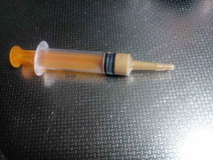 病院から、先に針を付けない注射器を買って来てます。でも、先っぽがプラスチックで固いんです。