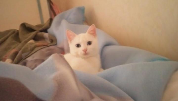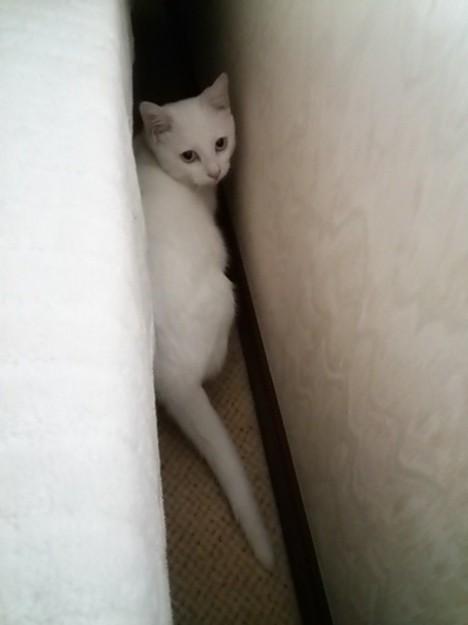 お気に入りの場所はベッド。いつも毛布にくるまって真ん中で寝ていますが、人が来るとさっとベッドサイドの隙間に籠もってしまいます。