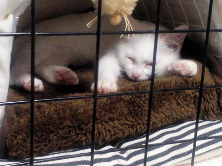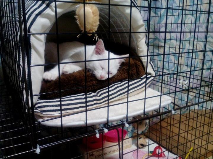 工事前までは、ドームの奥で丸くなってたのですが、床下暖房の設置で気持ち良いのかセナちゃんの緊張も一気に解けてグダグダでウトウト状態です。