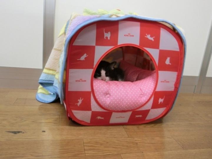 百均クッションで作ったべーさんお下がりのベッドを入れたら、湯たんぽのスペースがない・・・けどまあいいかなと思います。