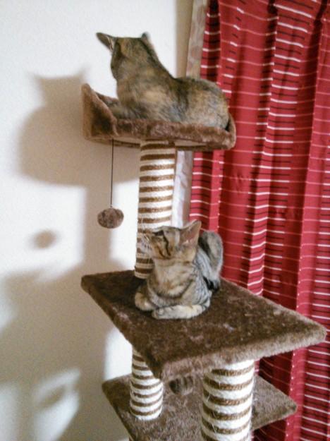 キャットタワーの最上階で二人でパシャ