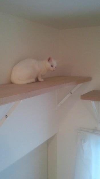 白猫ちゃん、現在、キャットウォークのある部屋に住んでいますが、キャットウォーク使ってくれるようになりました♪