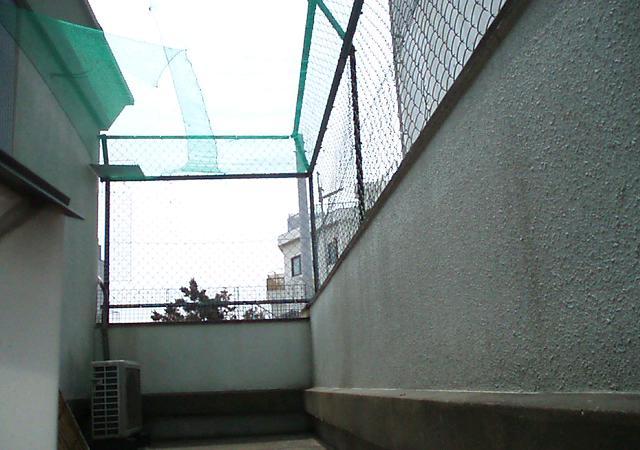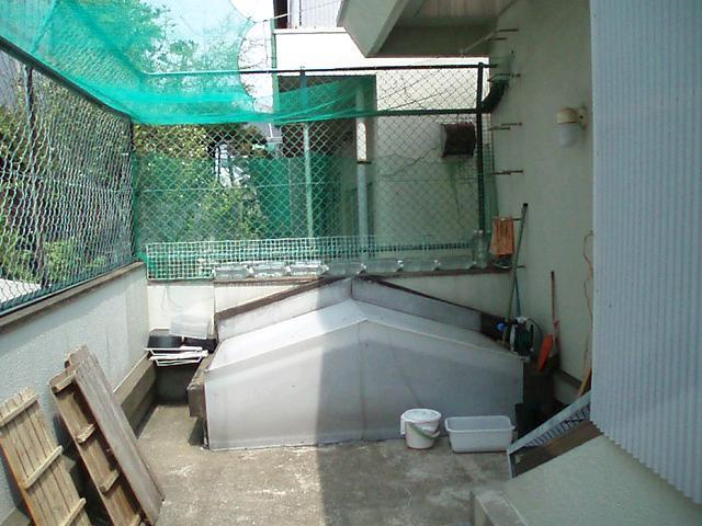 これが僕たちのいるテラス。テラスって言えるほど洒落たところではないけど。天井部分にネットが張ってあるでしょう。ゲンさん苦心の作だよ。