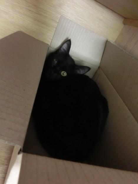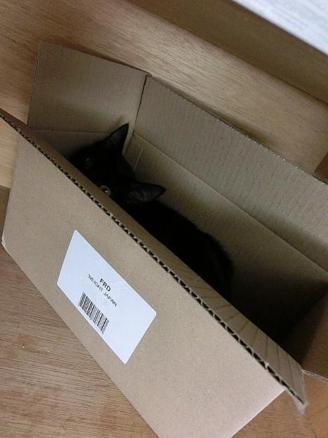 部屋が暑いのか、棚に置いてある空ダンボール箱でくつろいでいた。元気なシャー!付き。