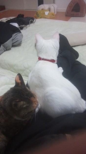 ↓みきちゃんの方が、最初に飛び乗ってきて、ここちゃんは、横でふて寝してます。