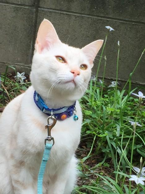 うちの猫は首輪にリードをつけて庭に出すのですが、チロは木登りをよくするので首吊りになるといけないと思い首抜けできるようにゆるくしてました。