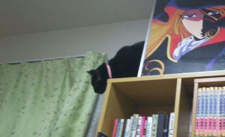 はーろが乗ってる本棚の隣に、窓下までの高さの本棚があって、そこから飛び上がってます。