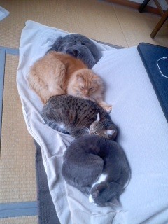 ニャンズ達は、こたつ布団の上で丸くなっています。