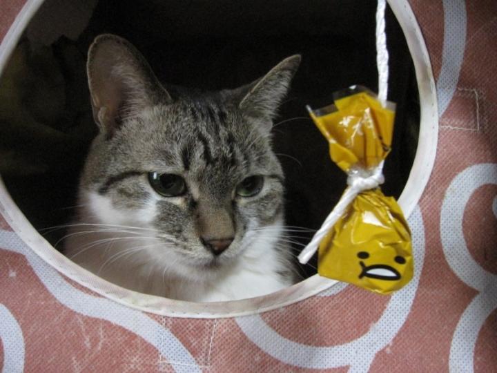近くにあったぐでたまのチョコに紐をつけて揺らしてみました。