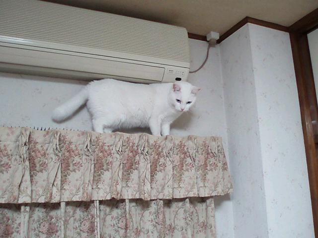 お部屋でお利口な僕だけど、唯一のいたずらはカーテンレールに登ることなんだ。だからゲンさんも百均で猫よけのトゲトゲ買って来て置いてるんだけどへっちゃらさ。ひょいひょい歩いて行くよ。