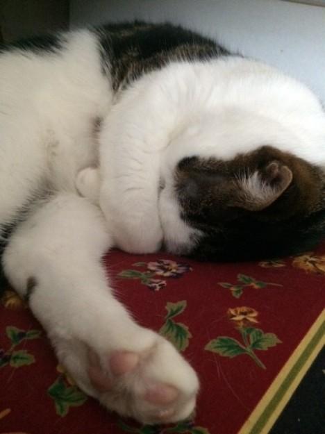 顔を隠してますが、この手とかがすっごくかわいくて、肉球もたまりません。